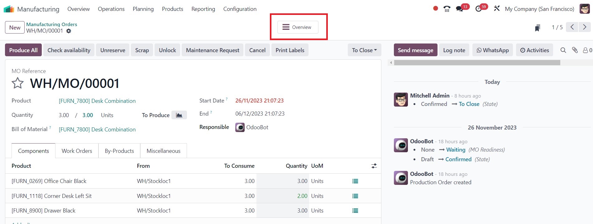 Odoo 17. versijā tagad ir jauns pārskats par ražošanas pasūtījumiem.