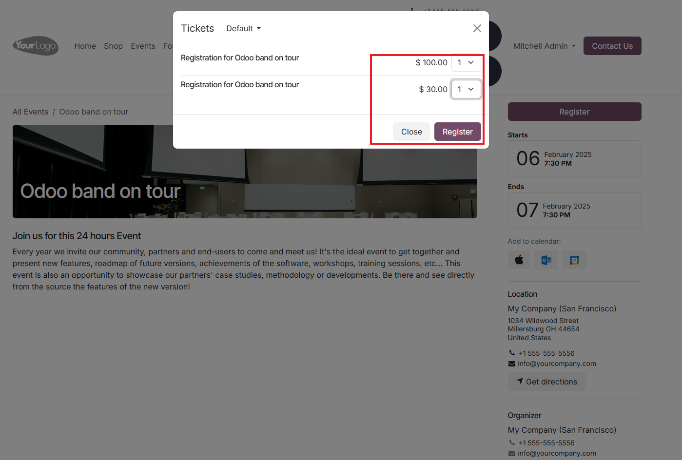 - Integrated POS Ticket Sales: Sell tickets directly through Odoo POS for last-minute buyers.